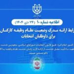 🔺شرایط ارائه مدرک وضعیت نظام وظیفه کارکنان دولت برای داوطلبان انتخابات اطلاعیه شماره ۱۰ ستاد انتخابات کشور: 🔹به آگاهی هممیهنان گرامی میرساند، مستند به تبصره بند «ح» ماده «۳۷» قانون انتخابات شوراهای اسلامی کشور، متعهدین خدمت به دولت در هنگام ایفای تعهد با تأیید محل خدمت، از ارائه کارت پایان خدمت نظام وظیفه یا کارت معافیت دائم مستثنی میباشند، لذا داوطلبان مشمول این تبصره میتوانند با ارائه تاییدیه محل خدمت خود، در انتخابات هفتمین دوره شوراهای اسلامی کشور ثبتنام نمایند. 🔹ضمناً با توجه به صراحت قانونی بند «۱۰» ماده «۳۱» قانون انتخابات مجلس شورای اسلامی مبنی بر الزام داوطلبان مرد انتخابات مذکور به ارائه کارت پایان خدمت نظام وظیفه یا کارت معافیت دائم از خدمت، داوطلبان مشمول انتخابات میاندوره ای دوازدهمین دوره مجلس شورای اسلامی که دارای معافیت تحصیلی یا تعهد به خدمت بوده و کارت پایان خدمت یا معافیت دائم را اخذ ننمودهاند، شرایط بندهای فوق برای آنها قابل احراز نمیباشد؛ بنابراین نمیتوانند به عنوان داوطلب ثبتنام نمایند.