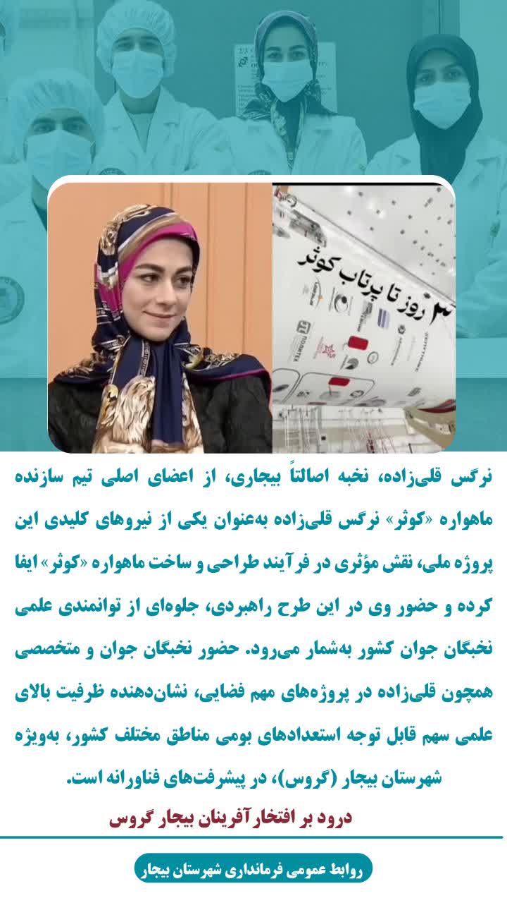 🔹| نرگس قلی‌زاده به‌عنوان یکی از نیروهای کلیدی این پروژه ملی، نقش مؤثری در فرآیند طراحی و ساخت ماهواره «کوثر» ایفا کرده و حضور وی در این طرح راهبردی، جلوه‌ای از توانمندی علمی نخبگان جوان کشور به‌شمار می‌رود. 🔹| حضور نخبگان جوان و متخصصی همچون قلی‌زاده در پروژه‌های مهم فضایی، نشان‌دهنده ظرفیت بالای علمی سهم قابل توجه استعدادهای بومی مناطق مختلف کشور، به‌ویژه شهرستان بیجار (گروس)، در پیشرفت‌های فناورانه است. 🌹 | درود بر افتخارآفرینان بیجار گروس