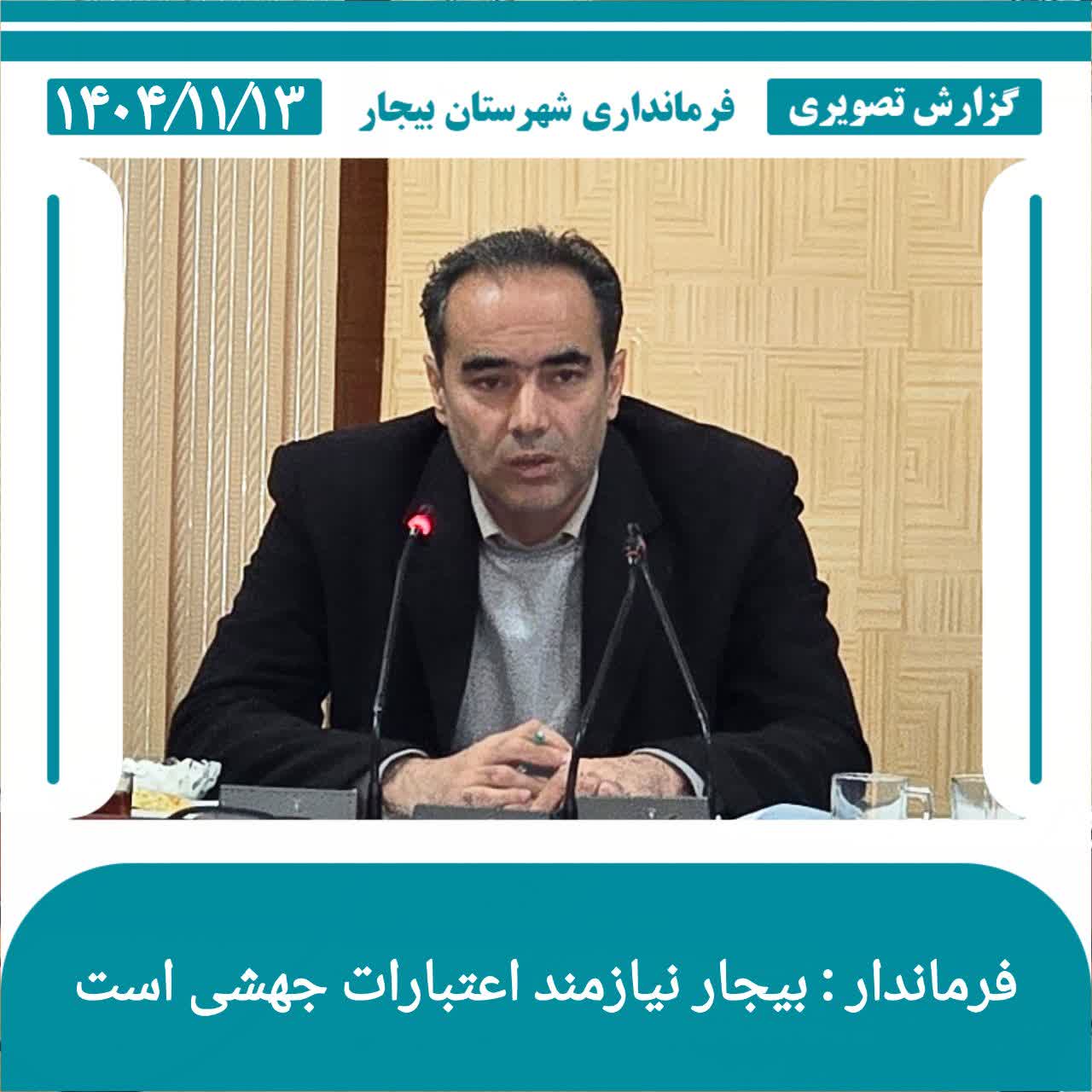 فرماندار شهرستان بیجار گفت: با توجه به گستردگی شهرستان، پراکندگی روستاها و نیازهای انباشته‌شده در حوزه‌های مختلف، ضروری است نگاه ویژه‌تر و تخصیص اعتبارات به‌صورت جهشی و هدفمند برای بیجار در نظر گرفته شود.